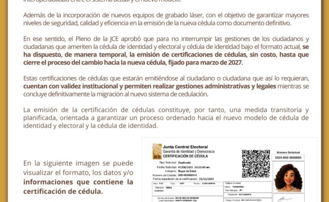 En ese sentido, el Pleno de la JCE para no interrumpir las gestiones de los ciudadanos y ciudadanas que ameriten la cédula de identidad y electoral y cédula de identidad bajo el formato actual dispuso, de manera temporal, la emisión de certificaciones de cédulas, sin costo, hasta que cierre el proceso del cambio hacia la nueva cédula fijado para marzo de 2027.